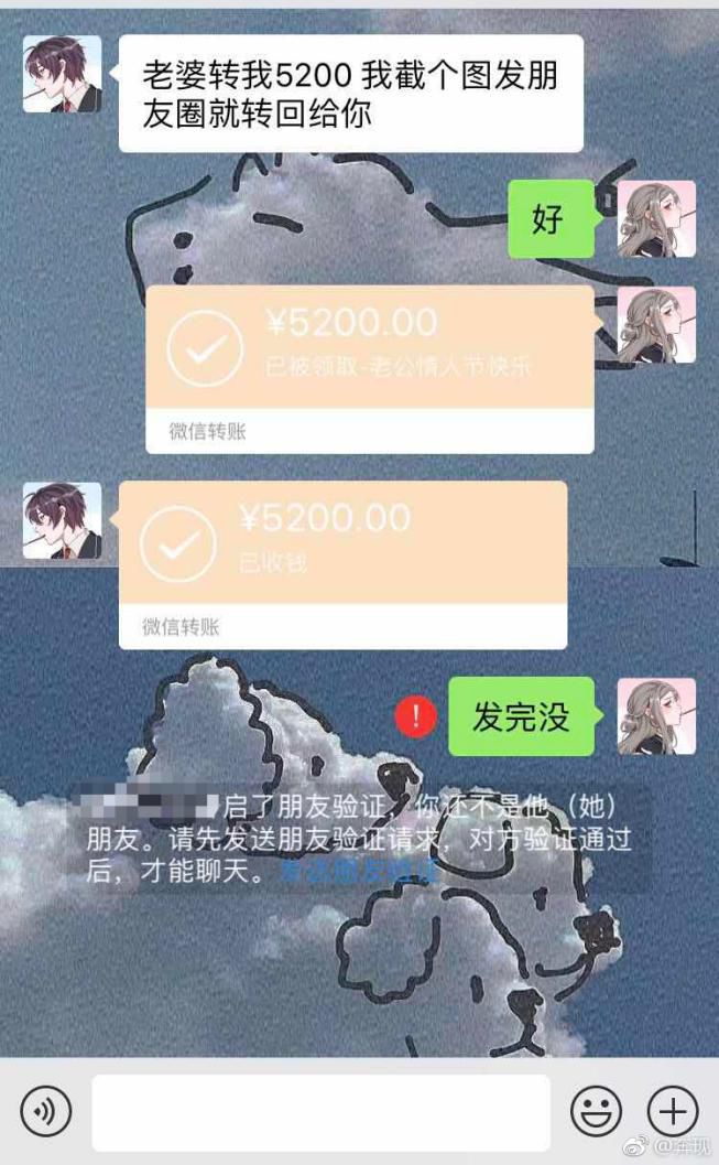 情人节男友让女友转账,说截图发个朋友圈就转回来,结果当然是“紧张刺激又舒服”。